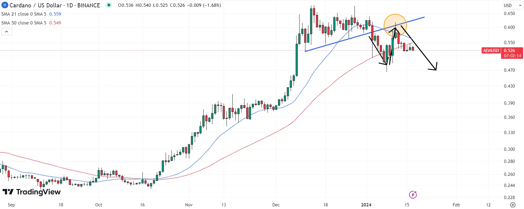 Cardano (ADA) Price Chart / Source: TradingViewSince that failed retest, the Cardano price has slid below both its 21 and 50DMAs.