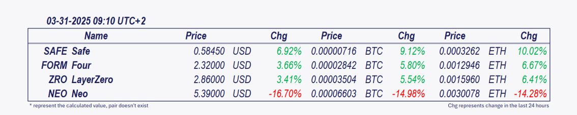 Safe і Four**:** Ці криптовалюти виросли вражаюче за останні 24 години, при цьому Safe збільшився на 7.64% з півночі, що робить його помітним.