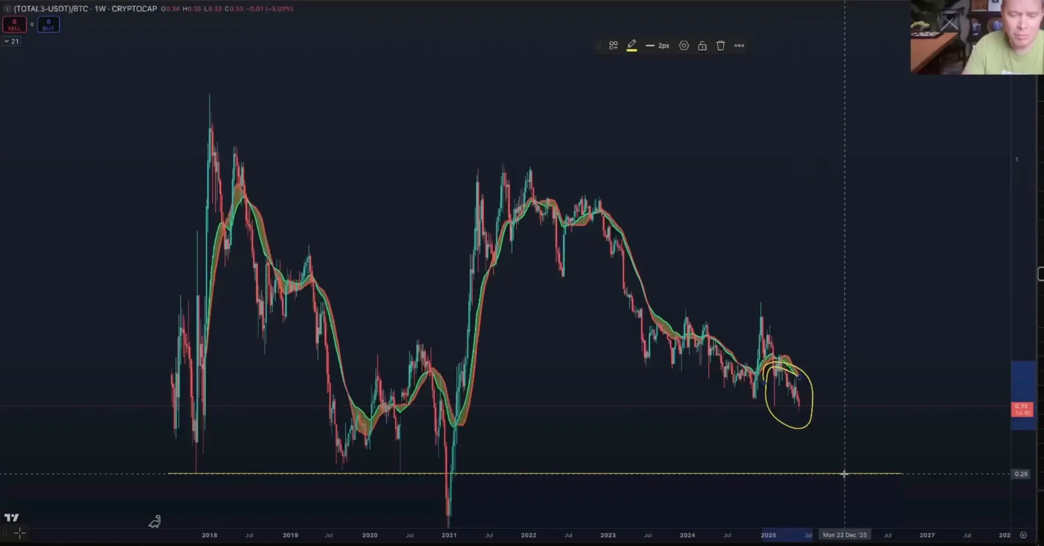 На нещодавній сесії з аналізу стратегії Коуен поділився, що графік TOTAL 3, який відстежує загальну ринкову капіталізацію всіх цифрових активів, крім Bitcoin, Ethereum (ETH) та стейблкоїнів, все ще знаходиться на низхідній траєкторії по відношенню до BTC і ще не знайшов ринкового дна.