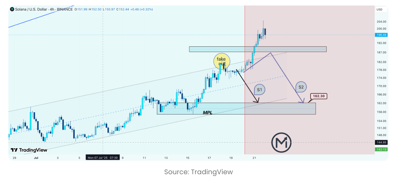 Технічний аналіз б’є тривогу: хибні прориви та ведмежі сценарії Незважаючи на те, що загальний настрій на ринку є позитивним, один криптовалютний аналітик попередив про зростаючий ведмежий тиск на Solana. Його аналіз вказує на те, що нещодавнє зростання, яке спонукало SOL подолати позначку в 190 доларів, насправді є класичним “хибним проривом” (fakeout).