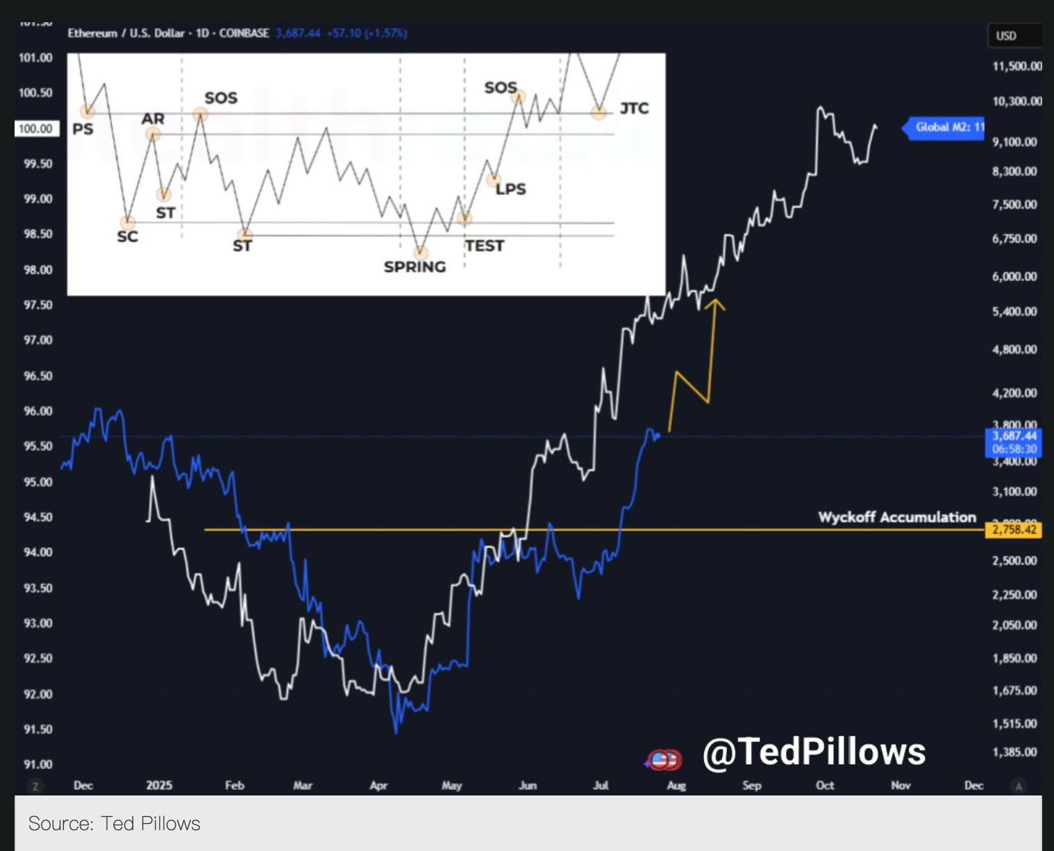 Як довгостроковий та рішучий прихильник Ethereum, керівник проекту WLF Ерік Трамп (син Трампа) нещодавно знову публічно висловив свою бичачу позицію щодо ETH. Він посилається на дослідження криптовалютного аналітика Теда Піллоу, який зазначає: “Порівнюючи** глобальну траєкторію зростання M2 грошової маси**, поточна ціна ETH повинна бути на рівні 8000 доларів вище, що підкреслює його значне недооцінення.” Трамп на цю думку чітко відповів “згоден”.