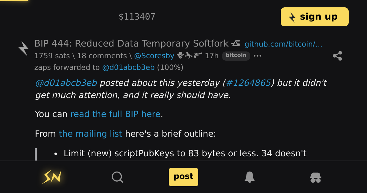 Цю пропозицію написав «Dathon Ohm», який приєднався до GitHub та X лише за кілька днів до подачі пропозиції і не має очевидного досвіду в розробці Біткойн. Незважаючи на те, що походження автора викликає сумніви, зміст пропозиції безпосередньо вказує на проблему розширення даних, з якою наразі стикається Біткойн. Згідно з умовами пропозиції, вихід OP_RETURN буде обмежений до 83 байтів, а більшість інших scriptPubKey буде обмежена до 34 байтів, що ефективно завадить включенню великих скриптів або блоків даних у виходи.