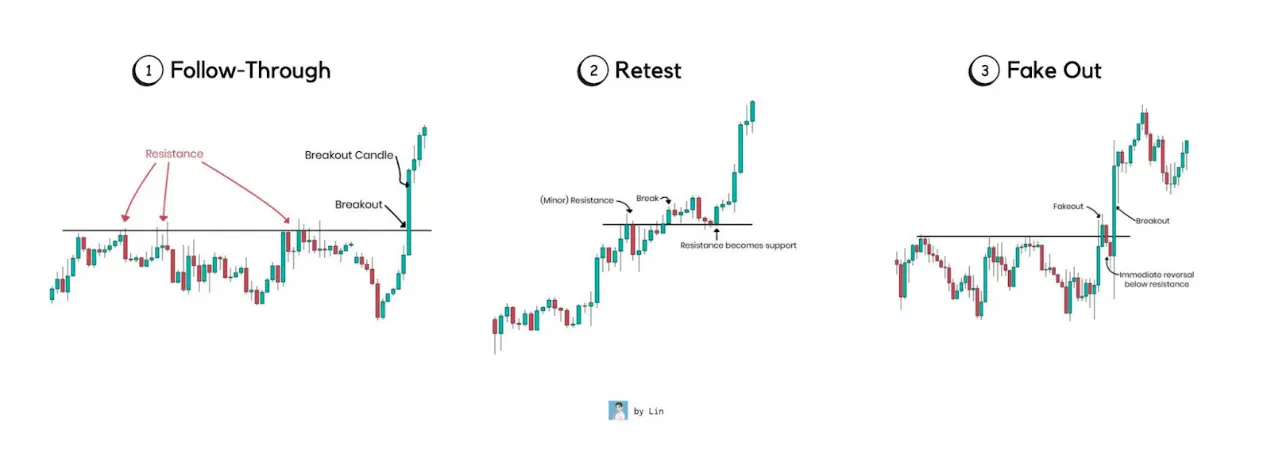 Крім того, ви можете контролювати ризик. Коли ціна прориває рівень, можливі три сценарії: