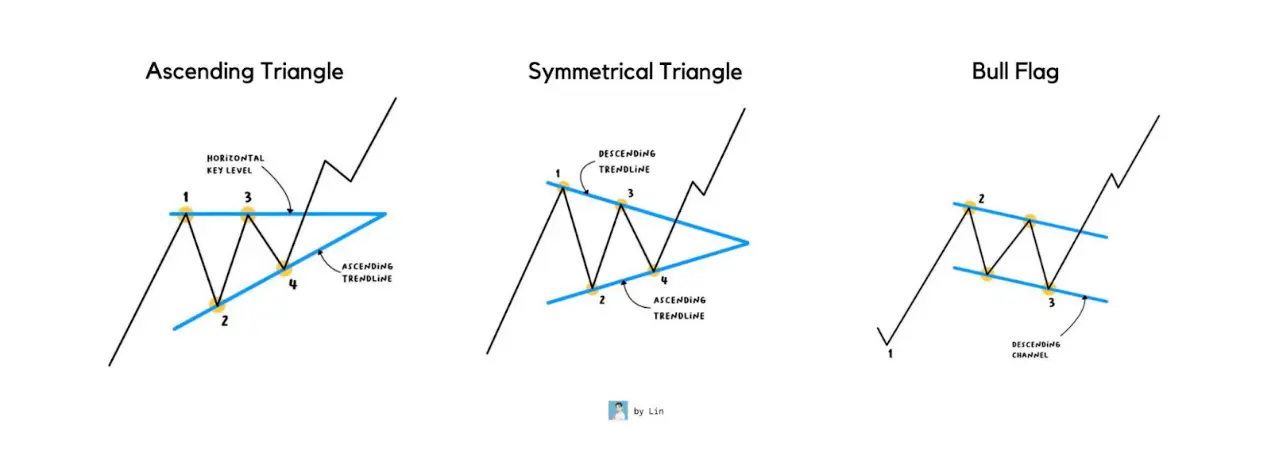Коли ціна зростає і зупиняється, ці дна називають моделями продовження. Найпоширеніші — прапор і трикутник.