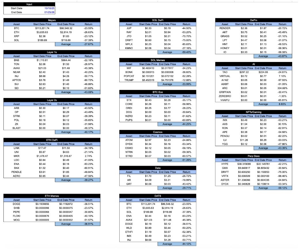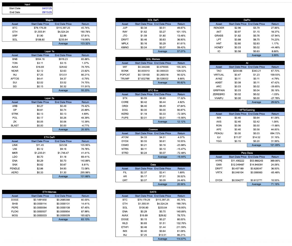 У період буму ринку ця таблиця виглядала б трохи оптимістичніше. «Хороші» токени зазвичай показують кращі результати, ніж «погані». Але здоровий механізм має працювати навпаки: ви хочете, щоб хороші токени показували кращі результати навіть у погані часи, а не лише під час буму. Нижче наведена та сама таблиця з 7 квітня до 15 вересня.