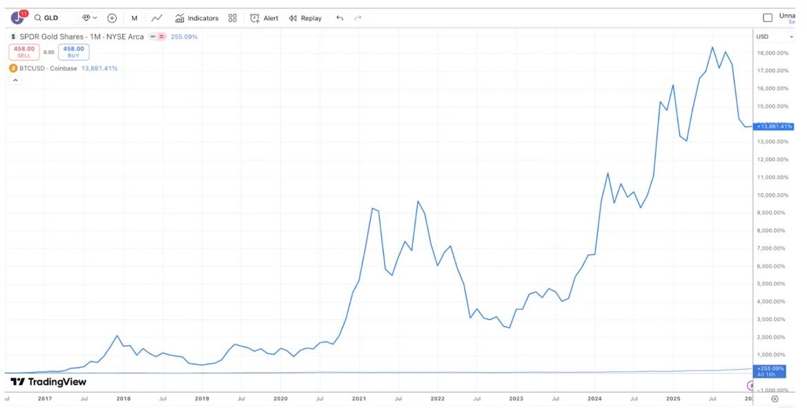Джерело TradingView, порівняння доходності за останні 10 років між біткоїном (BTC) та золотом (GLD)