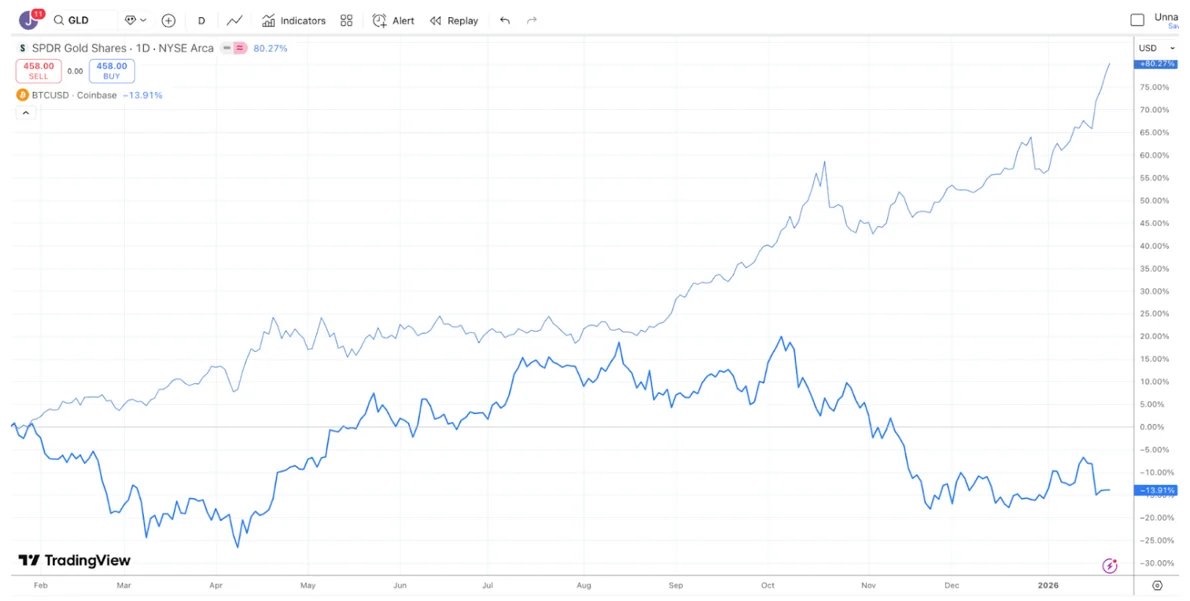 Джерело TradingView, порівняння доходності за останній рік між біткоїном (BTC) та золотом (GLD)