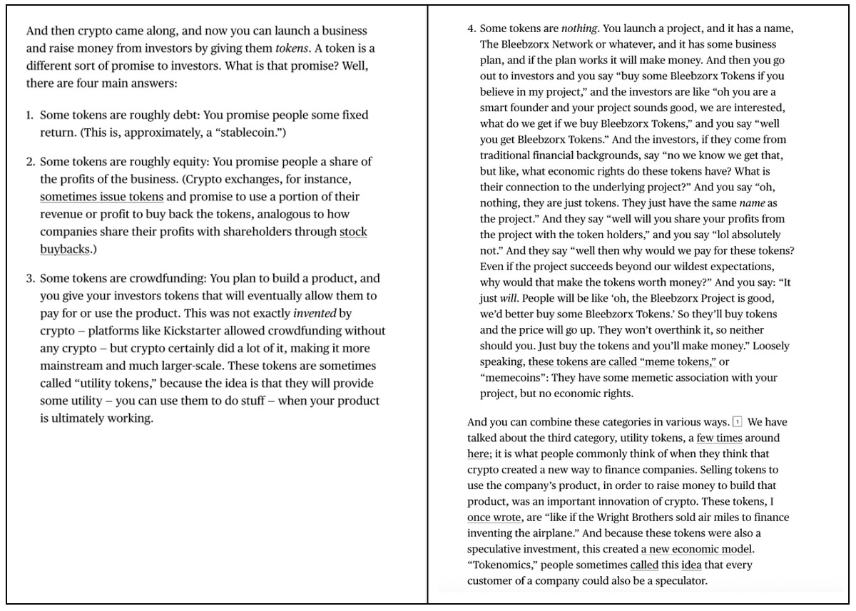 Саме тому стаття Мэтта Левіна про токени, яку він нещодавно написав, стала такою популярною і несподіваною. За всього 4 короткі абзаци Левін точно описав різницю і нюанси між різними токенами. Це дає мені надію, що подібний аналіз ще можливий.