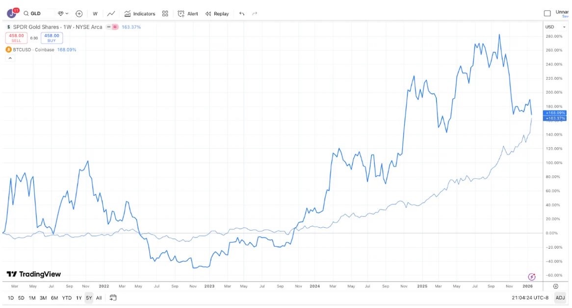 Джерело TradingView, порівняння доходності за останні 5 років між біткоїном (BTC) та золотом (GLD)