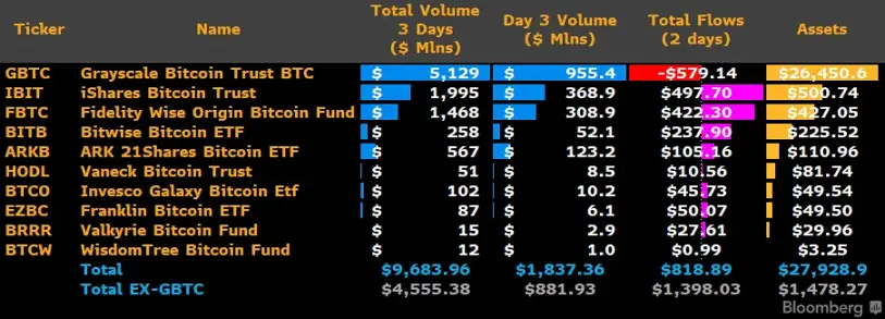 З обсягом торгів, що наближався до 10 мільярдів доларів за три дні, біткойн ETF мав величезний успіх, і всі виграли. Grayscale нарешті виставили на продаж, і вони це зробили. Загалом GBTC продала біткойни на суму понад 500 мільйонів доларів. До того часу Grayscale може лише купувати й утримувати.