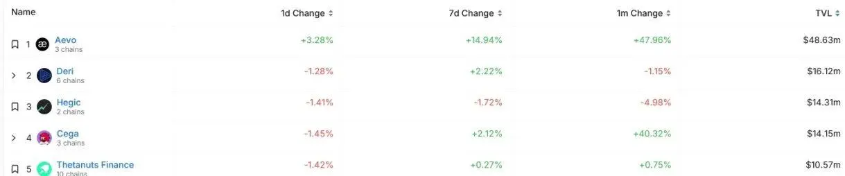Дані DefiLlama показують, що поточний TVL Aevo становить 48,5 мільйонів доларів США, 24-годинний обсяг торгів деривативами досягає 57,9 мільйонів доларів США, а сукупний обсяг торгів перевищує 3,74 мільярда доларів США. У категорії DefiLlama Options Aevo наразі посідає перше місце в TVL; у категорії on-chain деривативів вона займає десяте місце.