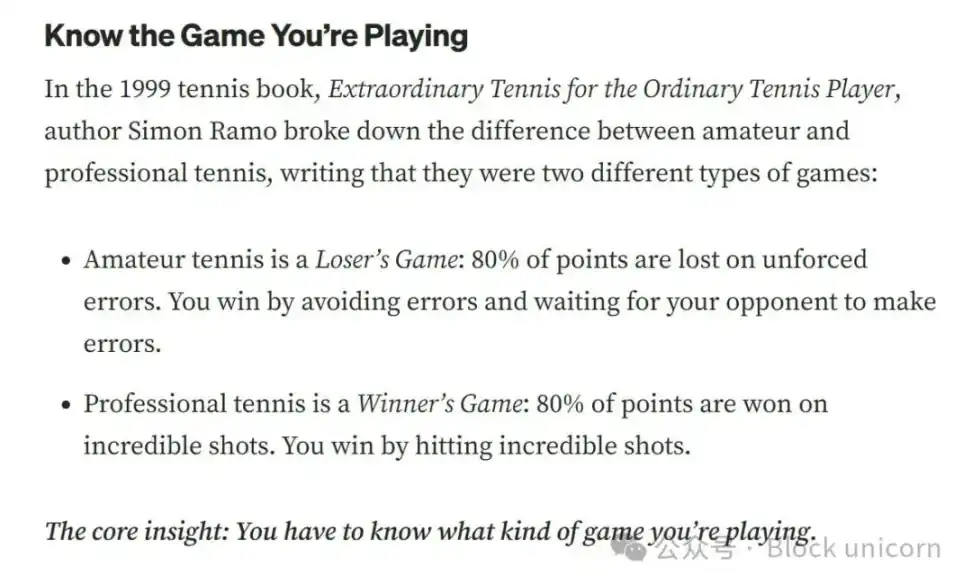 У першому випадку тенісист повинен докладати зусиль, щоб зменшити кількість помилок, тому що, якщо вони це зроблять, зможуть перемогти більшість суперників, які роблять більше помилок. Це гра програвців, оскільки меншою кількістю програшів, ніж у більшості, можна стати переможцем.