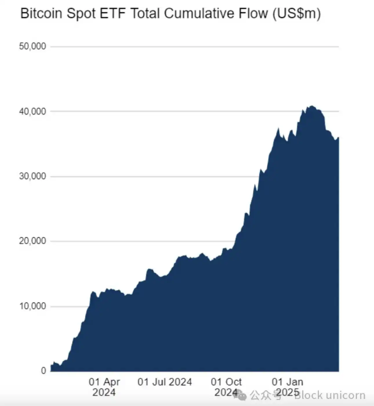 Станом на початок 2025 року майже вся ліквідність ETF перейшла до біткоїна, загальна сума досягла 40 мільярдів доларів, як показано на графіку. Не дивно, що ефір протягом багатьох років падає відносно біткоїна. Більшість альткоїнів також.
