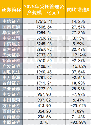 Щодо обсягів управління активами, 19 брокерів надали дані про обсяги довірчого управління активами за 2025 рік, що становить усього 6,33 трильйонів юанів, з приростом близько 12%.