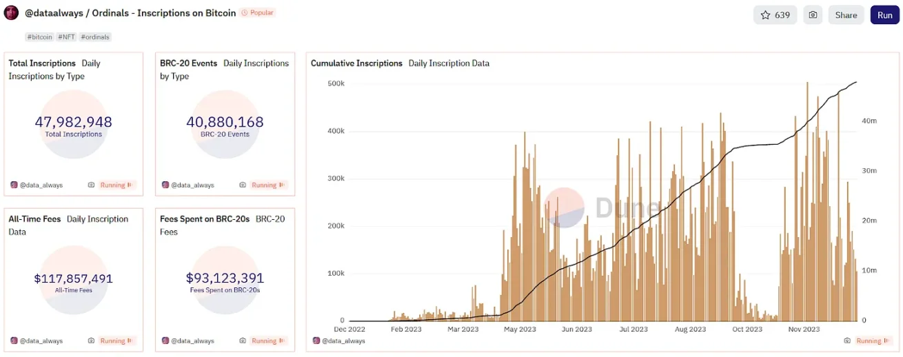 Năm 2023 là năm bùng nổ của Ordinals và token BRC-20. Nguồn dữ liệu: Dune @dataalways