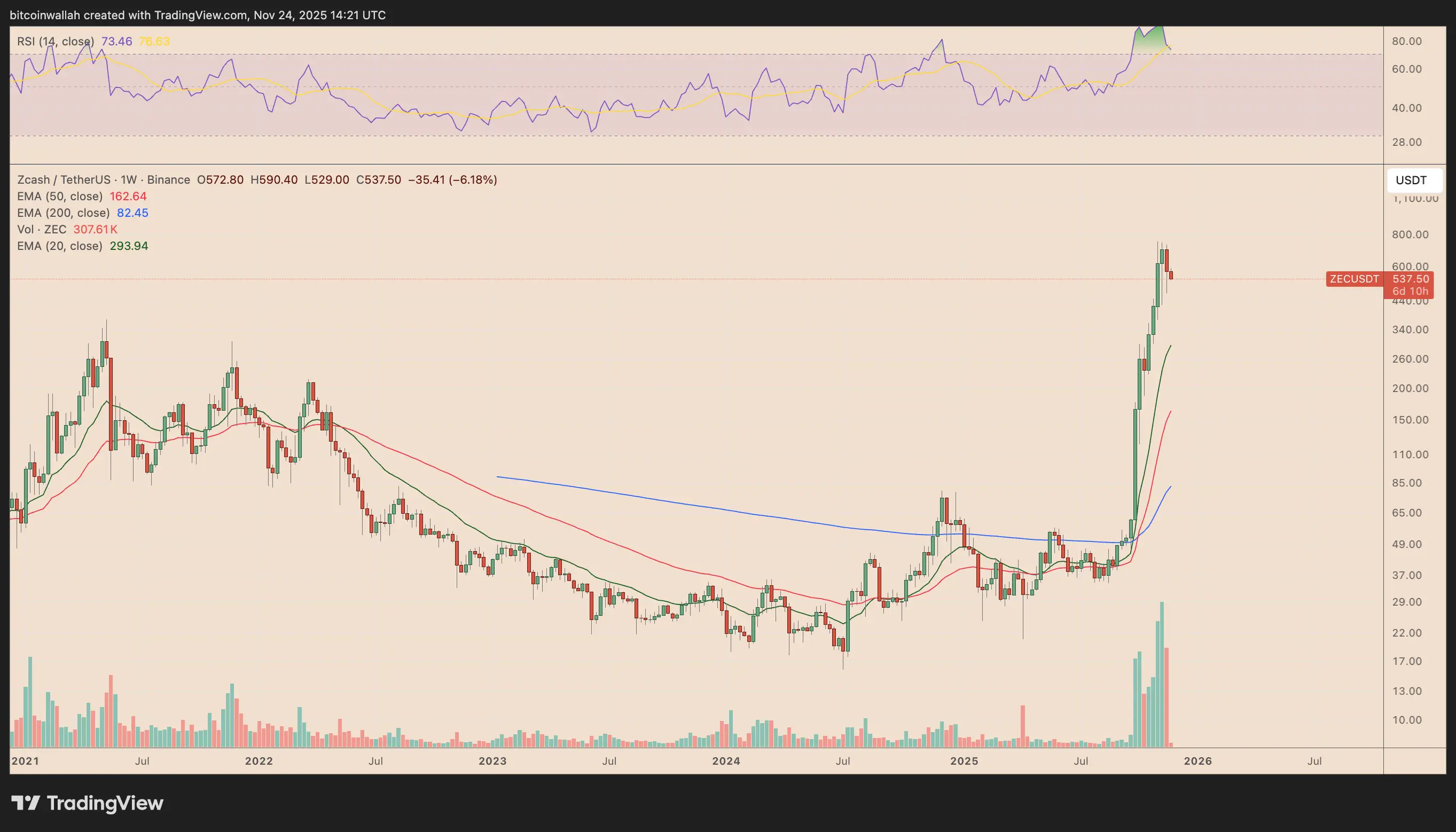 Biểu đồ hàng tuần ZEC/USDT. Nguồn: TradingView## Đường parabol BNB cảnh báo về sự điều chỉnh giá Zcash 60%