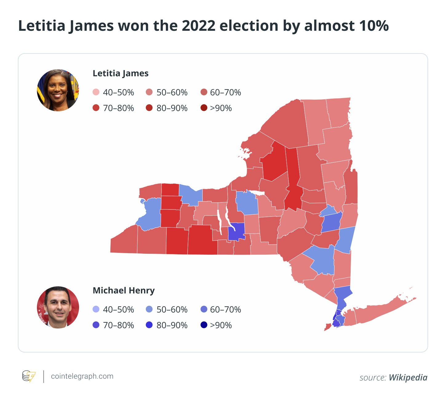 Dưới thời James, văn phòng Tổng Chưởng lý đã dẫn dắt các hành động thực thi chống lại một số công ty tiền điện tử, bao gồm Bitfinex và công ty mẹ của Tether, iFinex. Tổng Chưởng lý đã kiện công ty này vì đã trộn lẫn quỹ của khách hàng và quỹ công ty để che giấu $850 triệu đã bị mất tích. Văn phòng của bà cũng đã thu hồi được $50 triệu cho các nhà đầu tư bị lừa đảo trong chương trình Earn của Gemini.