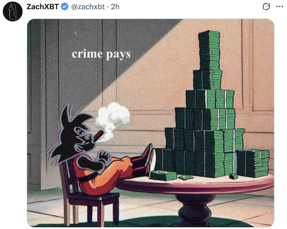 Bài đăng nhanh chóng thu hút sự chú ý và điều tra viên trên chuỗi nổi tiếng ZachXBT (@zachxbt) đã đáp lại bằng một meme chế giễu “tội phạm phải trả giá” (tội phạm có lợi), càng làm trầm trọng thêm những nghi ngờ và chỉ trích của thế giới bên ngoài về vụ việc.