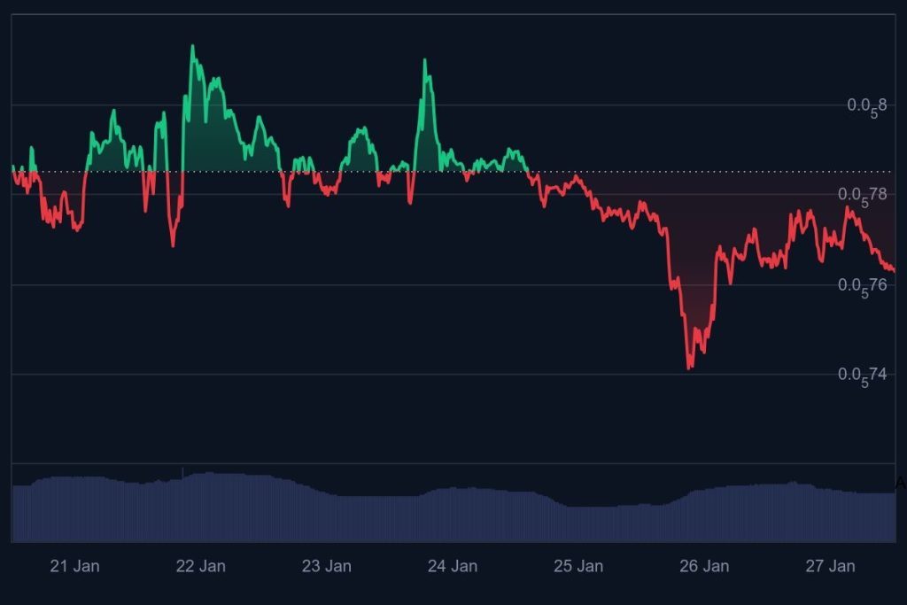 Dự đoán giá Shiba Inu tuần này chịu áp lực khi thị trường tiền điện tử gặp phải tâm lý hỗn hợp. Từ ngày 21 tháng 1 đến ngày 27 tháng 1, SHIB giảm từ $0.00000785 xuống còn $0.00000762, thể hiện mức giảm 3 %.
