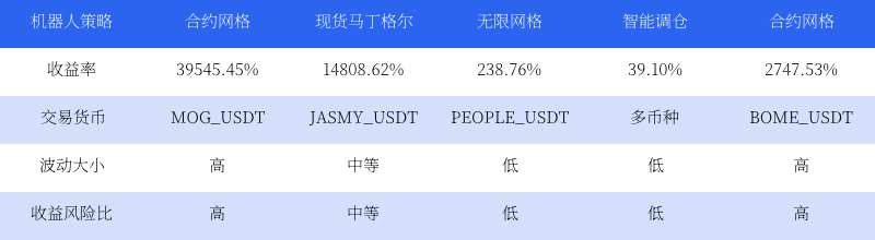 Dựa trên dữ liệu từ sàn giao dịch Gate, hiệu suất của các chiến lược robot trong tuần này có sự khác biệt. Chiến lược lưới hợp đồng đã có hiệu suất ấn tượng trong các loại tài sản có rủi ro cao và lợi nhuận cao, như chiến lược MOG_USDT với tỷ lệ lợi nhuận mới nhất lên đến 39545.45%. Trong khi đó, chiến lược Martin Gale trên các loại tài sản có rủi ro thấp cũng có hiệu suất tốt, như chiến lược ZEC_USDT với tỷ lệ lợi nhuận mới nhất là 14662.88%. Nói chung, mặc dù các chiến lược có rủi ro cao và lợi nhuận cao có thể mang lại lợi nhuận đáng kể, nhưng cũng đối mặt với rủi ro lỗ nhiều hơn; so với đó, các chiến lược có rủi ro thấp mang lại lợi nhuận tương đối ổn định và rủi ro có thể kiểm soát được.