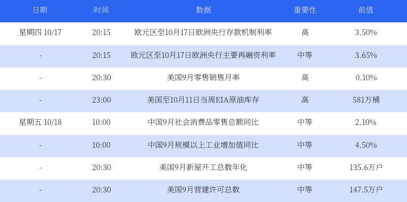Ngày 17 tháng 10, Lãi suất khu vực euro của Ngân hàng trung ương Châu Âu sẽ là dữ liệu trọng điểm nhất tuần này. Thị trường dự báo Ngân hàng trung ương Châu Âu sẽ tăng lãi suất một lần nữa để đối phó với lạm phát, theo dõi mức độ tăng lãi suất.