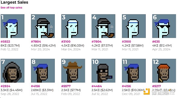 Một số Token lớn nhất không thể thay thế doanh số bán hàng bằng tiền điện tử là CryptoPunks và sự đa dạng “Alien” của loạt PFP này chiếm vị trí hàng đầu trong bảng xếp hạng doanh số! Alien Punk 5822 được bán với giá kỷ lục 8k ETH (24 triệu USD) gần đỉnh của bong bóng Token 2022, với hai trong số những bộ sưu tập được tìm kiếm nhiều này đổi chủ với mức giá 8 con số vào năm 2024.