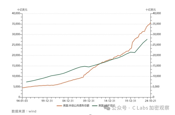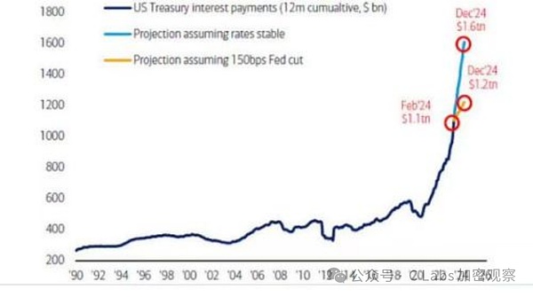 Nhưng vào năm 2024, chỉ việc trả lãi nợ Mỹ sẽ vượt qua 10 nghìn tỷ đô la Mỹ, chiếm đến một phần tư thu nhập của Mỹ, nhiều hơn cả chi phí quốc phòng và chi trả bảo hiểm xã hội.