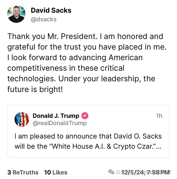 Gần đây, David O. Sacks, người được bổ nhiệm mới của Hoa Kỳ làm vị vua tiền mã hóa, chức vụ chính thức của họ là “Hoàng đế trí tuệ nhân tạo và tiền mã hóa của Nhà Trắng”.