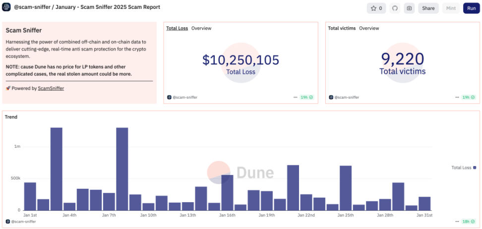 Vào tháng 1 năm 2025, đã xảy ra tổng cộng 40 vụ sự cố an ninh Web3, dẫn đến tổng thiệt hại khoảng 8.794 triệu USD, có 1.47 triệu USD được hoàn trả, nguyên nhân của sự cố liên quan đến lỗ hổng hợp đồng, tài khoản bị hack và rò rỉ Khóa riêng. Ngoài ra, có 9.220 nạn nhân của các vụ đánh bắt cá mập trong tháng này, tổng thiệt hại lên đến 10.25 triệu USD.