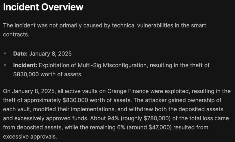 Vào ngày 8 tháng 1 năm 2025, Orange Finance, một dự án quản lý thanh khoản dựa trên Arbitrum, đã bị khai thác do cấu hình sai multisig, dẫn đến hành vi trộm cắp tài sản trị giá 830.000 đô la. Những kẻ tấn công đã chiếm quyền sở hữu từng kho tiền, sửa đổi cách triển khai của chúng và rút tài sản ký gửi cũng như các khoản tiền được ủy quyền quá mức. Khoảng 94% tổng thiệt hại, tương đương khoảng 780.000 đô la, là do tài sản ký gửi, trong khi 6% còn lại (khoảng 47.000 đô la) là do ủy quyền quá mức.