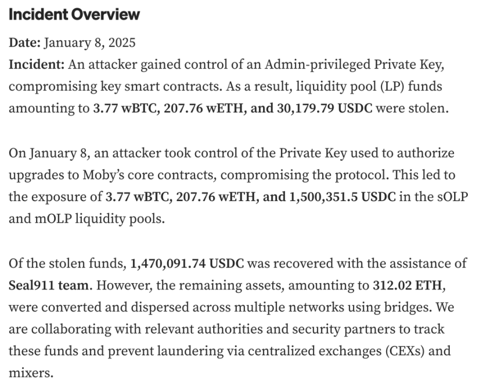 Vào ngày 8 tháng 1 năm 2025, một kẻ tấn công đã kiểm soát Khóa riêng, được sử dụng để ủy quyền nâng cấp hợp đồng cốt lõi của Moby, dẫn đến vi phạm giao thức. Cuộc tấn công đã khiến 3,77 wBTC, 207,76 wETH và 1.500.351,5 USDC trong các nhóm thanh khoản sOLP và mOLP gặp rủi ro. Moby, với sự hỗ trợ của nhóm Seal911, đã thu hồi được khoảng 1,47 triệu USDC.