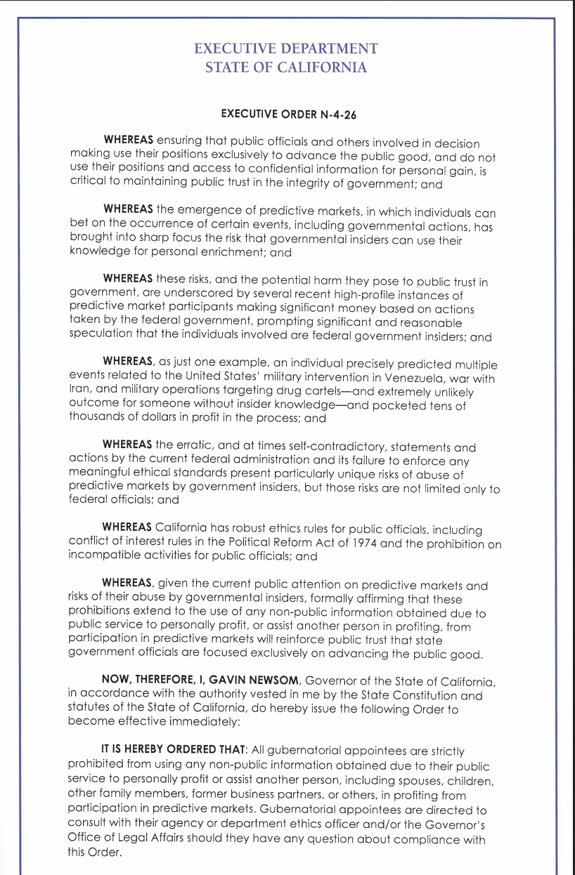 _Sắc lệnh của Thống đốc Newsom về việc các nhân viên chính phủ sử dụng thông tin không công khai để kiếm lợi từ các thị trường dự đoán. Nguồn: _Thống đốc California