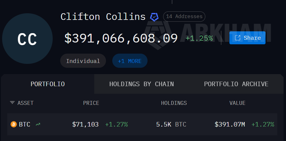 Arkham liệt kê Collins kiểm soát 14 địa chỉ với tổng số holdings là 5.500 Bitcoin, trị giá hơn 391 triệu đô la.