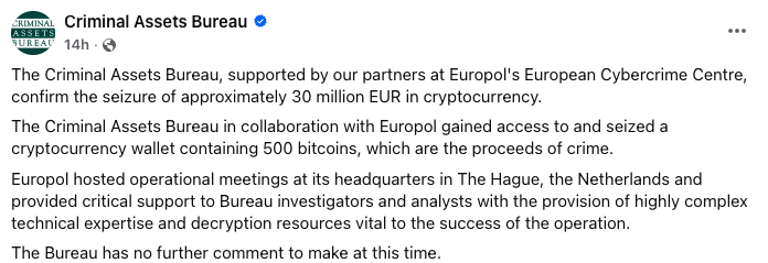 Cục Tài sản Tội phạm Ireland (CAB) cho biết trong một tuyên bố vào thứ Ba rằng họ đã “tiếp cận và thu giữ một ví tiền điện tử” chứa 500 Bitcoin (BTC), trị giá hơn 35 triệu đô la, với sự giúp đỡ của Trung tâm Tội phạm mạng châu Âu của Europol.
