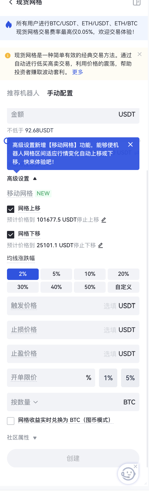 交易機器人主頁 - 現貨網格-點擊“交易機器人” - 網格機器人 - 現貨網格 - 手動配置 -高級設置- 填寫移動網格相關參數