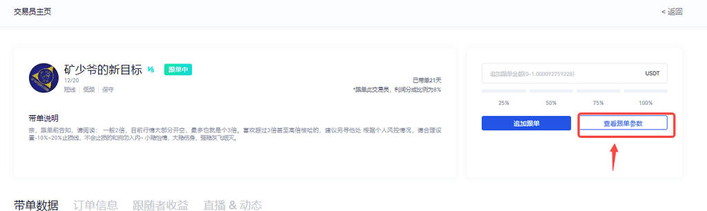 調整跟單參數具體流程如下圖:進入實盤跟單主頁-進入對應“帶單者主頁”-點擊“查看跟單參數”-調整對應參數