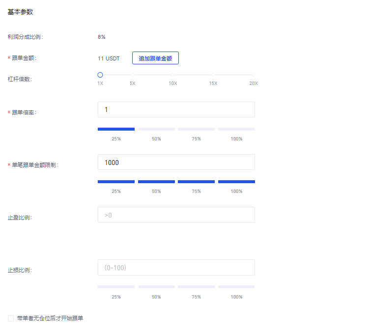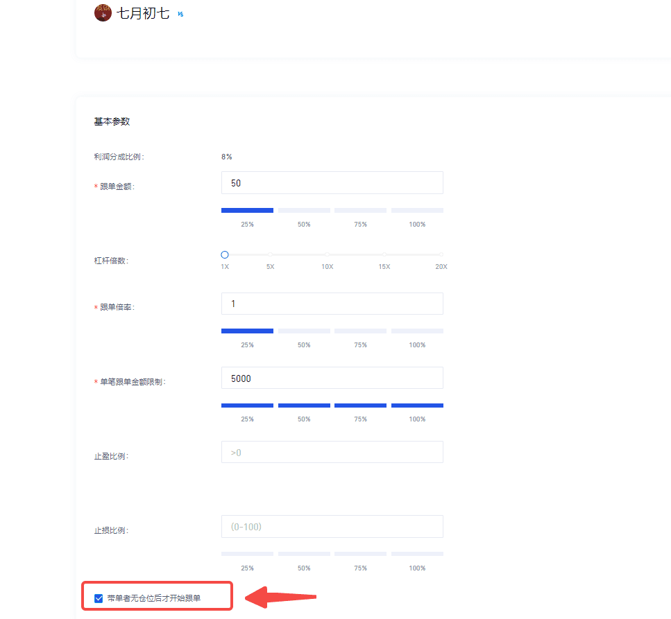溫馨提示:為儘量保證跟單者與帶單者收益率接近,跟單者儘量勾選“帶單者無倉位後才開始跟單”