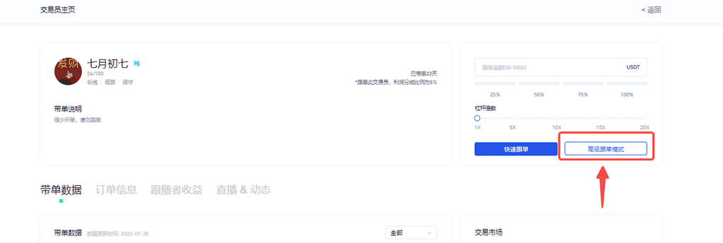 將要跟單用戶具體流程如下圖所示:進入實盤跟單主頁-篩選帶單員-點擊跟單按鈕,勾選“帶單者無倉位後才開始跟單”-或進入帶單員主頁--選擇高級跟單模式-勾選“帶單者無倉位後才開始跟單”
