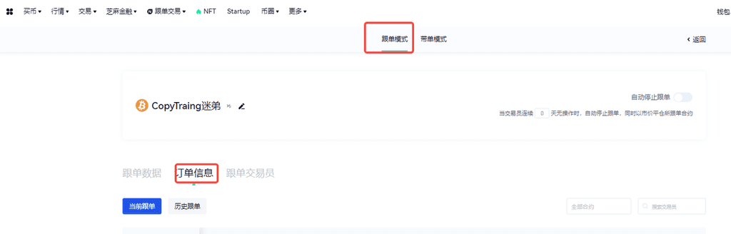 已跟單用戶具體流程如上圖所示:進入實盤跟單主頁-進入對應“帶單者主頁”-點擊“查看跟單參數”-勾選“帶單者無倉位後才開始跟單”