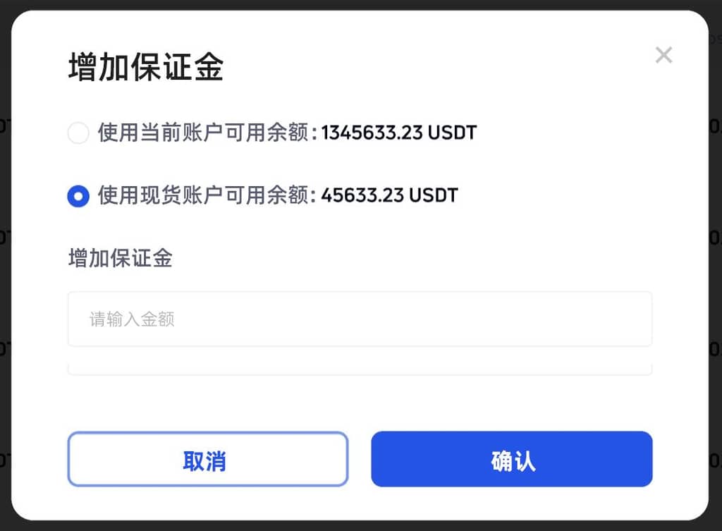 跟單者在跟單過程中如跟隨帶單者已開單,可追加保證金以保證跟單的持續性,追加保證金可選擇現貨賬戶的可用餘額或當前跟單賬戶的可用餘額。