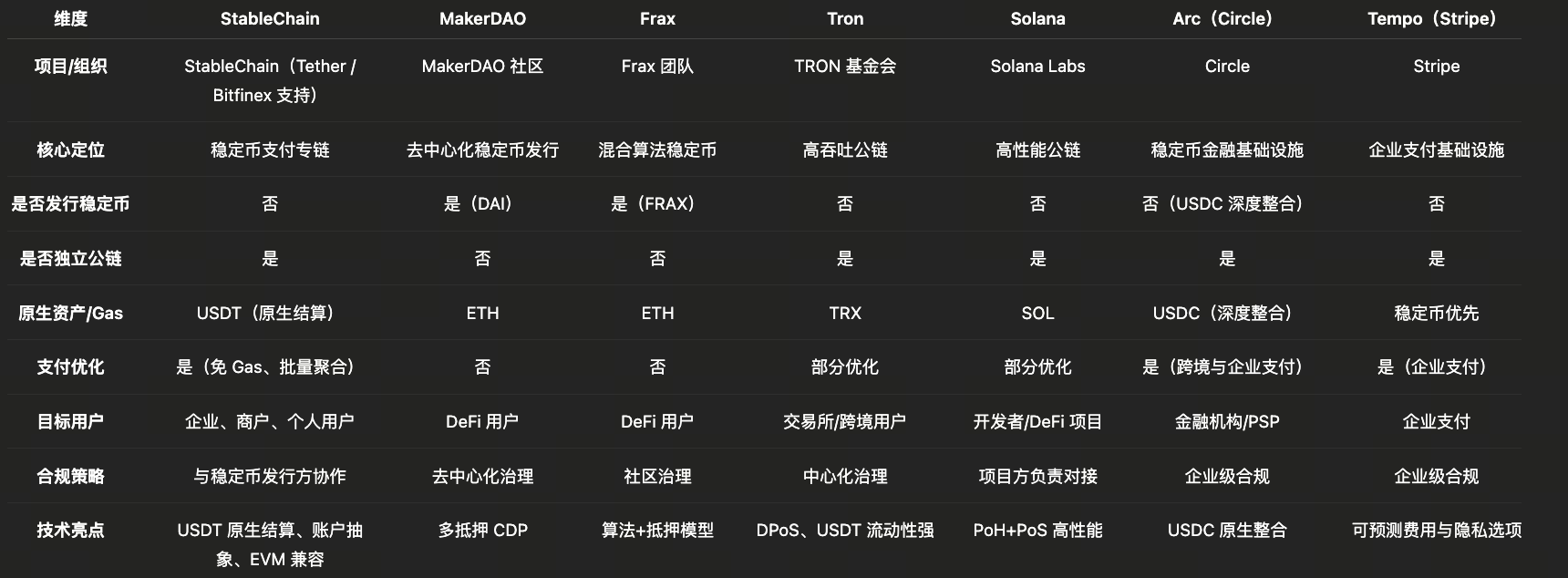 StableChain 在定位上與現有穩定幣生態及競爭對手有明顯區隔: