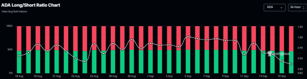 盡管如此,漲價的情景尚未完全被排除。如果ADA在0.84 USD的支撐區間保持穩定,這個幣仍然有機會反彈,朝着8月14日的峯值1.02 USD邁進。