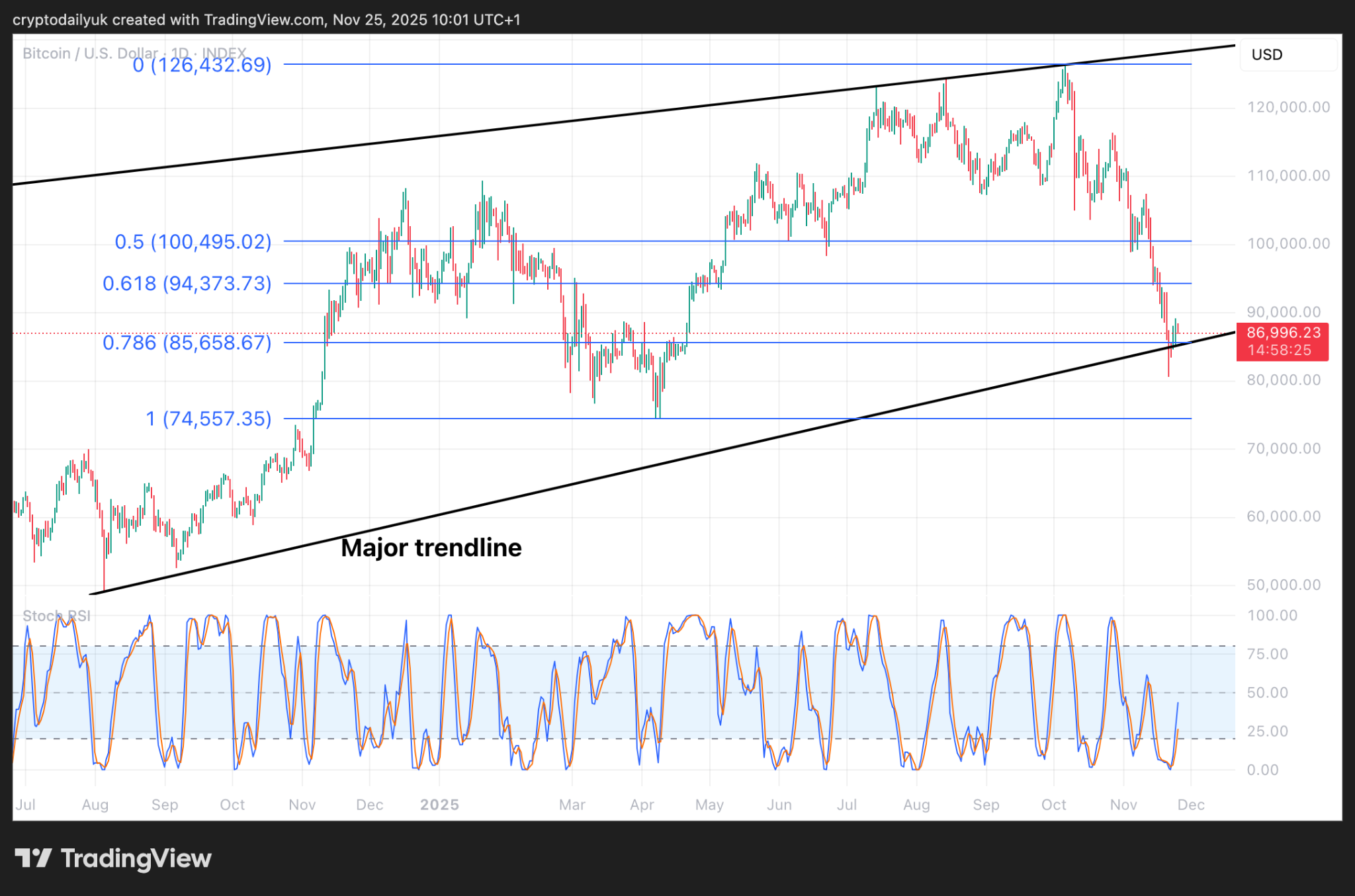日線中的斐波那契序列非常有信息量。斐波那契序列是從最後一個局部低點繪制到歷史最高點。這給出了預測的支撐位。可以看出,$BTC 價格可能在0.786的斐波那契回撤的最深處附近見底,價格爲$85,650。這個位置與主要的上升趨勢線完美對齊,使其成爲反彈的完美地點。0.618和5.0的斐波那契水平作爲阻力線的準確性進一步支持了這個看起來看漲的設置。