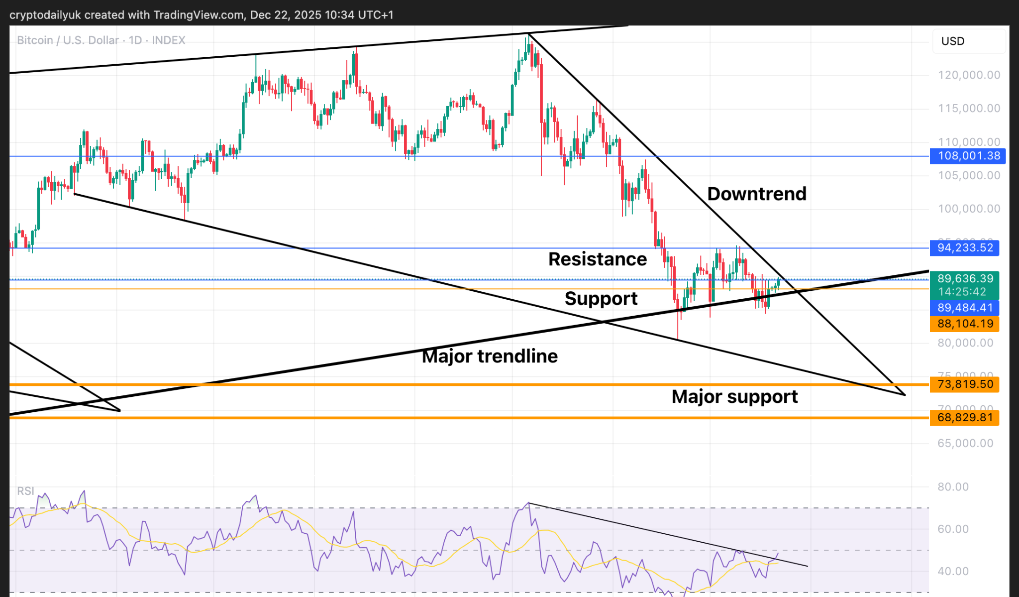 來源:加密貨幣日報 原始標題:BTC技術分析:在趨勢線測試之前預計還有一次下跌——下行趨勢遇到主要上升支撐 原文連結: https://cryptodaily.co.uk/2025/12/btc-technical-analysis-expect-one-more-drop-before-trendline-test-下行-meets-major-ascending-support 比特幣價格正在接近下行趨勢和主要上升趨勢線的匯聚點。這兩個中的一個將不得不被突破。也就是說,短期修正也即將開始。本週可能是下一個重大走勢開始的時候。