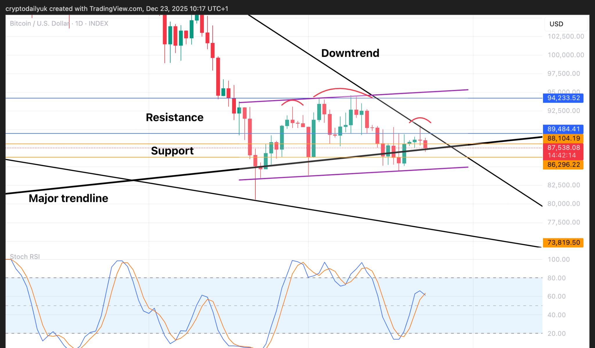 來源: 加密貨幣日報 原標題:比特幣 (BTC) 價格進入短期調整:預計周末前將出現突破 原文連結: https://cryptodaily.co.uk/2025/12/bitcoin-btc-price-enters-short-term-correction-imminent-breakout-expected-by-weekend