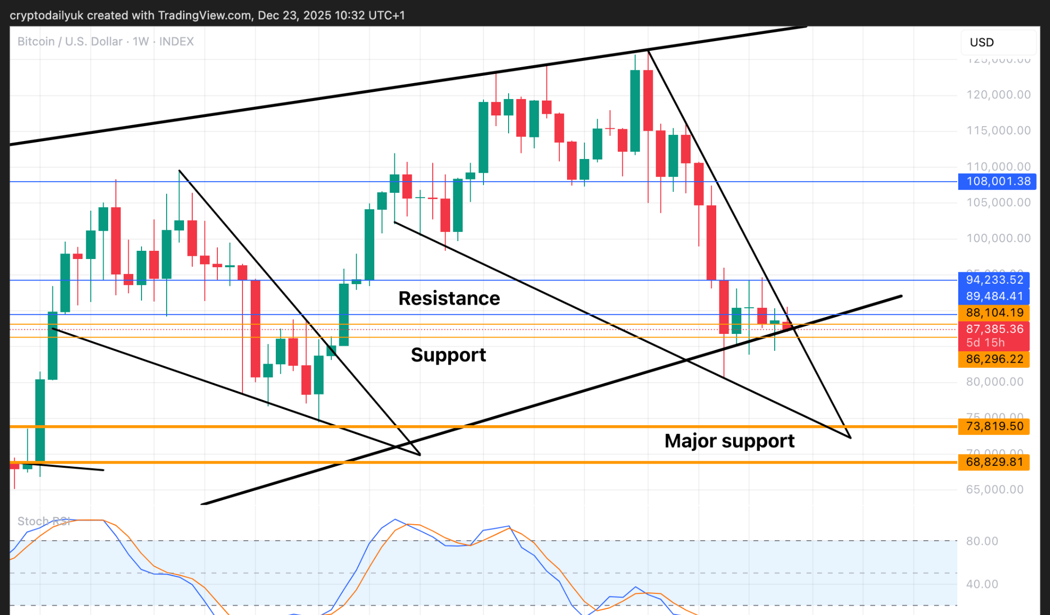 BTC價格處於邊緣。每週蠟燭收盤低於主要上升趨勢線可能意味着災難。也就是說,進入2026年,Bitcoin有許多看漲因素。這表明,只要美國股市保持強勁,任何形式的看跌突破仍然可以被逆轉。