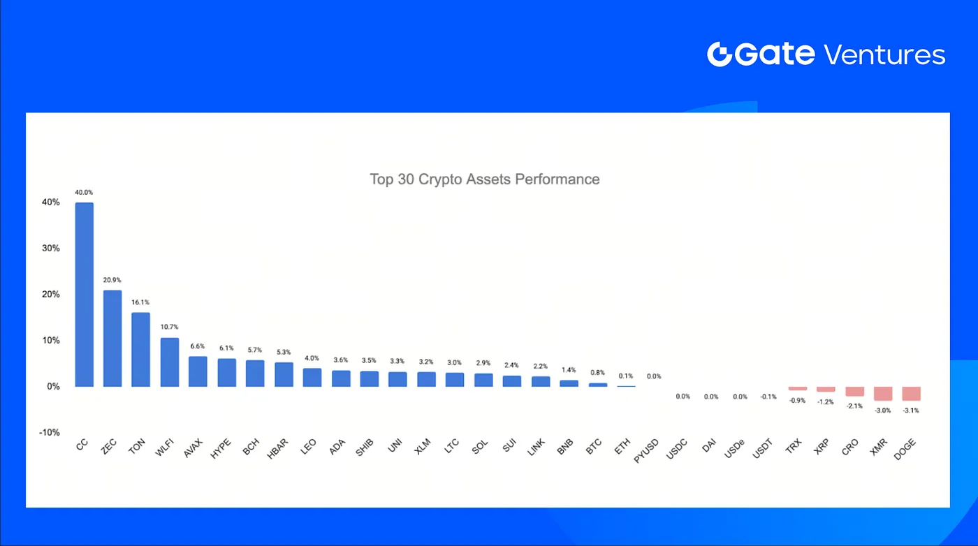 The top 30 cryptocurrencies by market capitalization posted an average gain of 3.92%, led by strong performances in Canton Network, Zcash, Toncoin, and World Liberty Financial.
