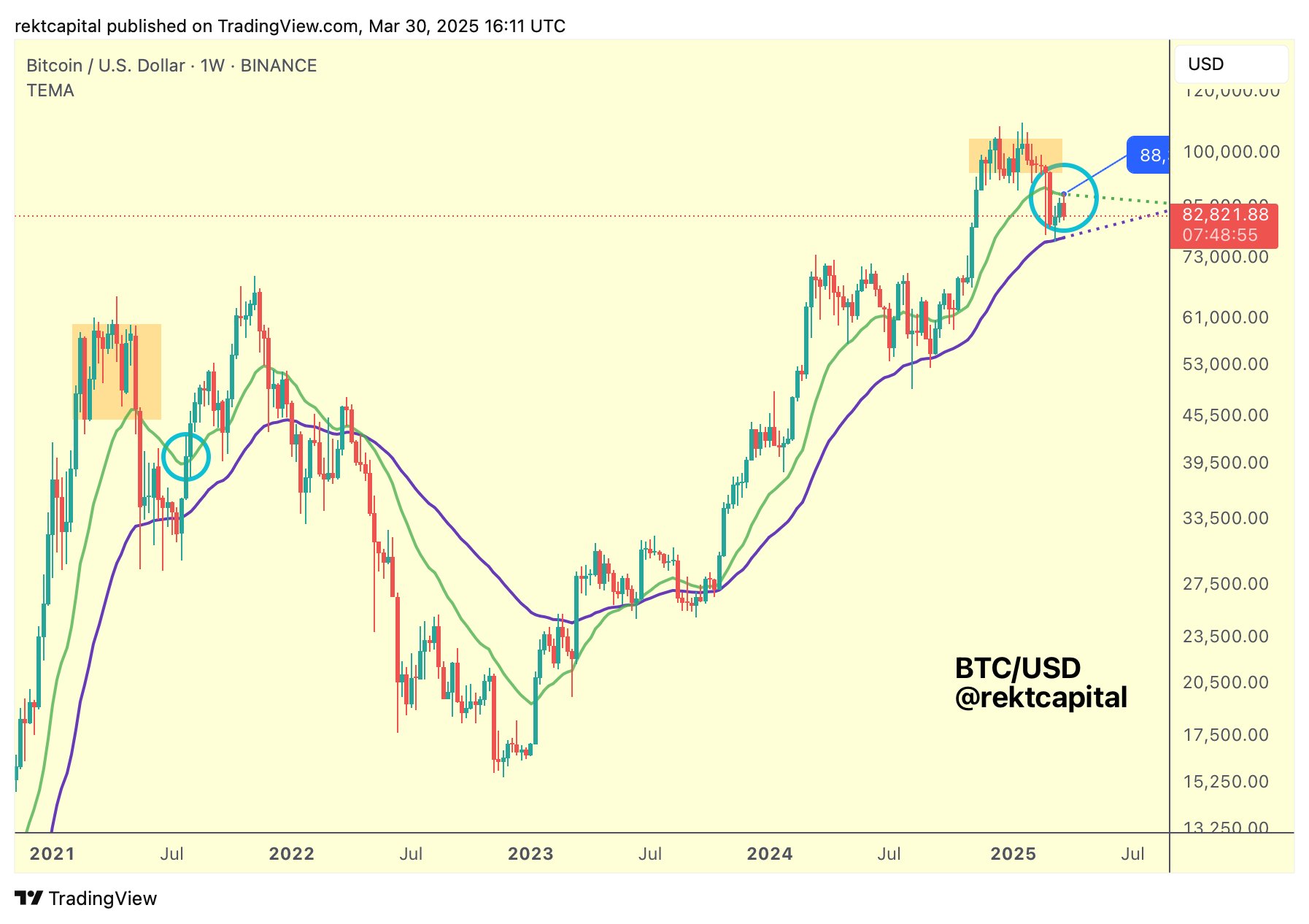 伪名的加密策略师Rekt Capital在社交媒体平台X上告诉他的542,600位粉丝,BTC似乎在复制2021年的价格走势,当时比特币在周线图上在两个关键的指数移动平均线(EMAs)之间盘整。