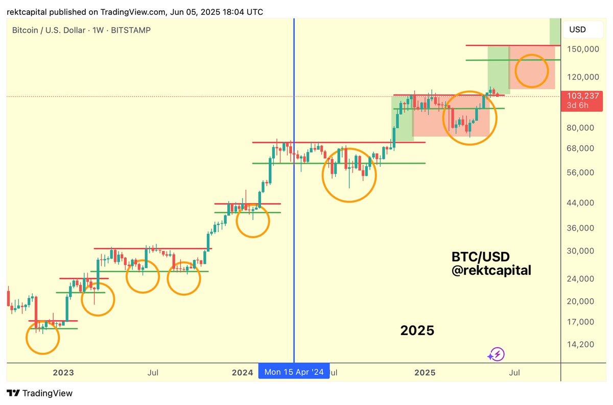 !Image来源:Rekt Capital/XRekt Capital表示,BTC本周收于104,400美元以上可能是它已成功重新测试需求区域并正在为更高的价格做准备的关键信号。