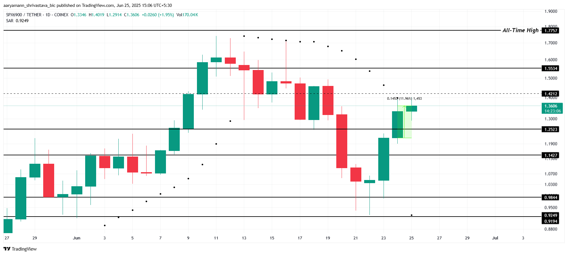 Parabolic SAR的支持,一个突出的技术指标,显示出强劲的上升趋势和价格有潜力突破1.42美元并转化为支持,同时为达到下一个阻力位1.55美元创造机会。然而,如果无法突破该阻力位,SPX可能会面临卖压,价格可能会回落到1.25美元,导致市场情绪的下降。